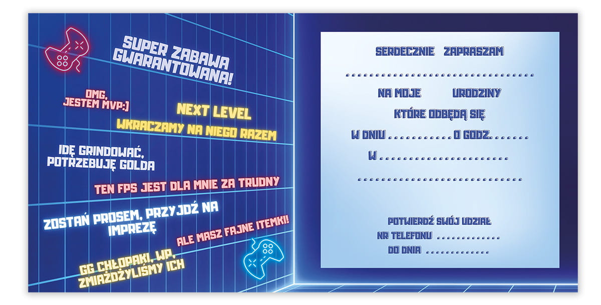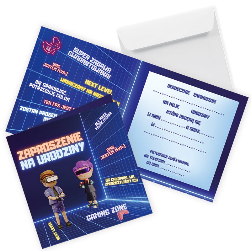 Zanurz się w Wirtualnym Świecie Urodzin! Zaprojektowane z pasją, nasze zaproszenia łączą w sobie neonowe kolory i grafikę z ulubionych gier, tworząc niezapomnianą atmosferę. Teksty takie jak "OMG, jestem MVP" czy "Ale masz fajne itemki" dodają autentyczności i radości.