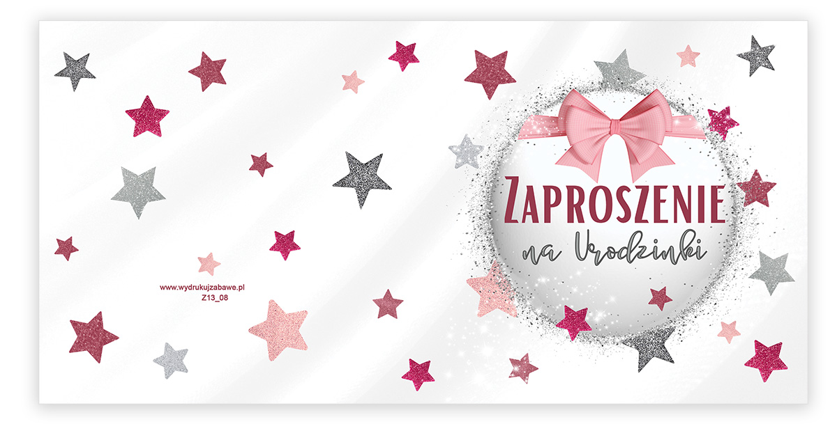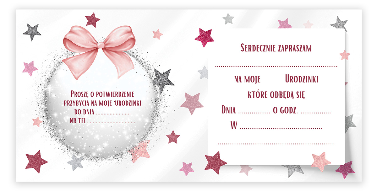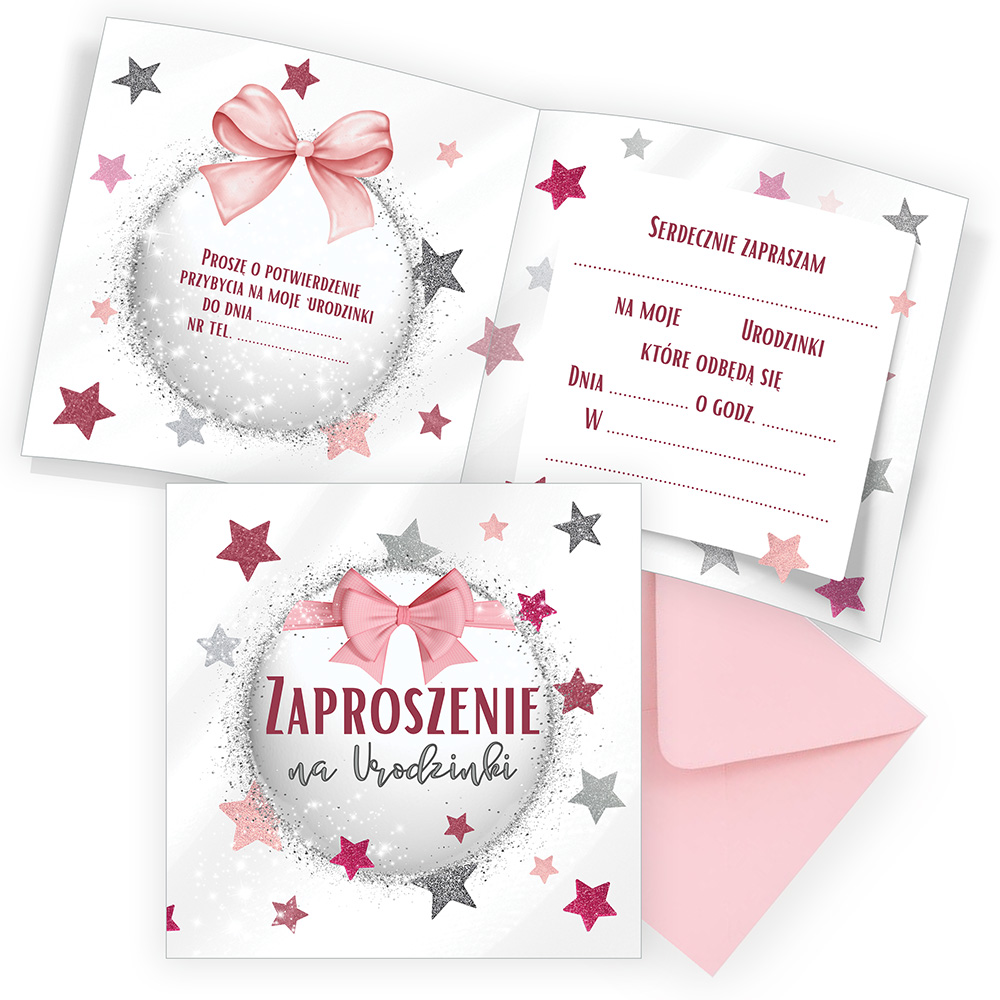 Urocze i dziewczęce zaproszenia na urodziny, idealne dla młodszej solenizantki. Okładka ozdobiona imitacją brokatu i kolorowymi gwiazdkami w odcieniach różu i srebra. W centrum znajduje się różowa kokardka. Wewnątrz zaproszenia ten sam bajkowy motyw i dużo miejsca na wpisanie szczegółów.