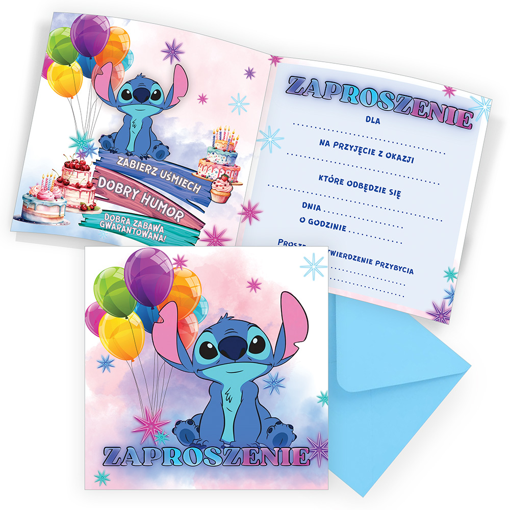 Na okładce znajduje się uroczy niebieski stworek w otoczeniu balonów i kolorowych gwiazdek. W środku znajdziesz hasło „Zabierz uśmiech i dobry humor – dobra zabawa gwarantowana!”, które idealnie oddaje klimat imprezy. Barwna grafika i pastelowe tło nadają całości lekkości i bajkowego uroku, a wnętrze jest czytelne i gotowe do uzupełnienia.