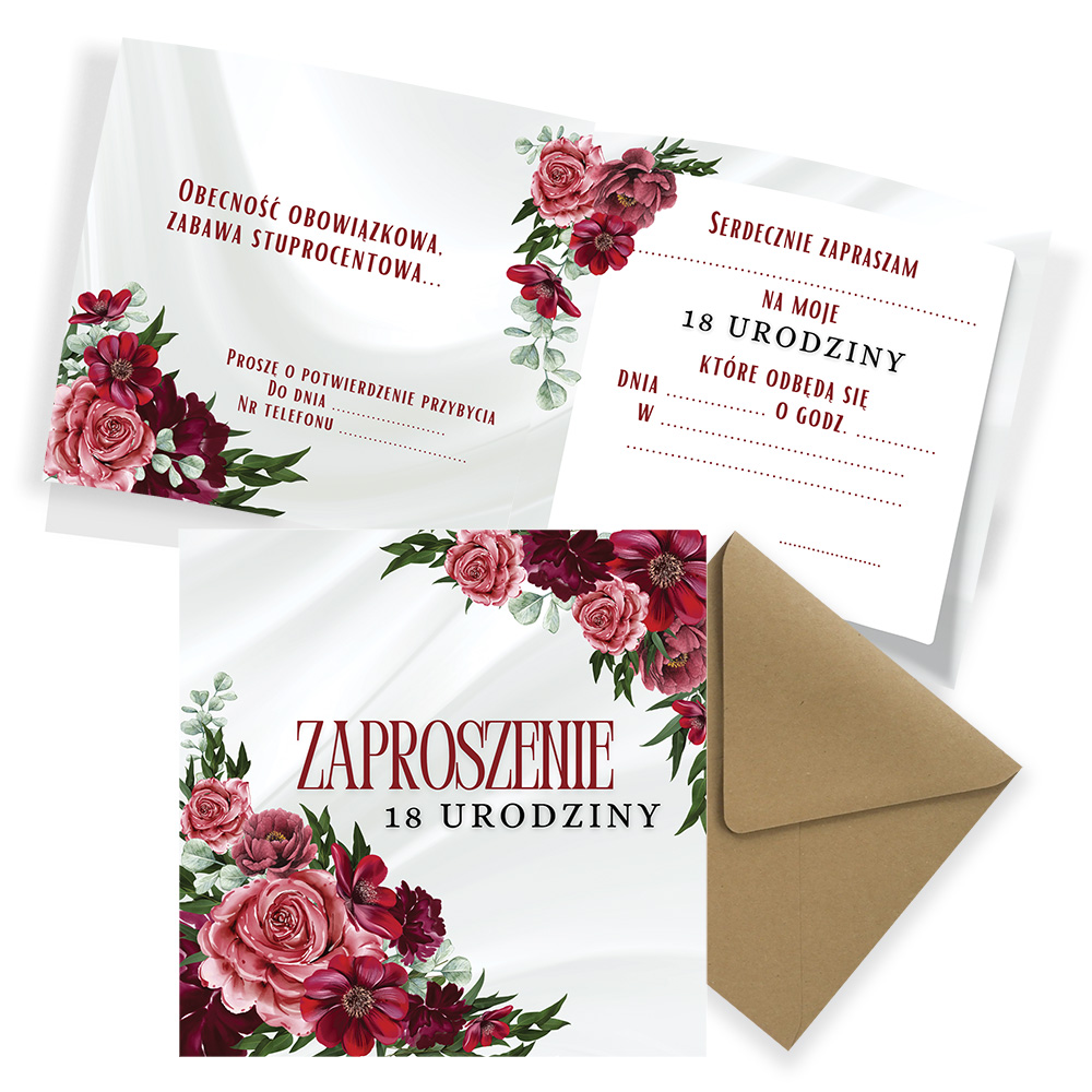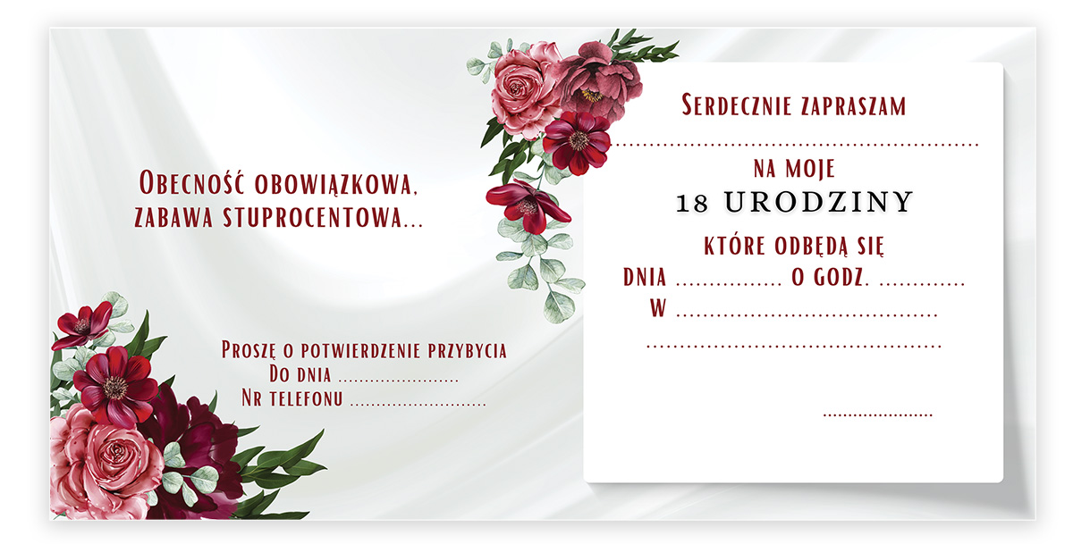 Eleganckie i romantyczne zaproszenia na 18 urodziny, utrzymane w delikatnej biało-bordowej kolorystyce. Okładkę zdobią bogate kompozycje kwiatowe, nadające zaproszeniu wyjątkowego uroku. W środku ozdobne kwiaty kontynuują motyw, a przejrzysty układ ułatwia personalizację treści.