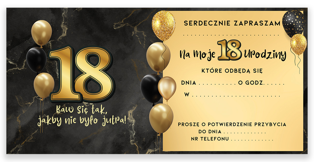Zaproszenia na osiemnaste urodziny nowoczesne i imprezowe, utrzymane w eleganckiej czarno-złotej kolorystyce. Na okładce duża, złota liczba „18” otoczona czarnymi i złotymi balonami, a całość dopełnia dynamiczny napis „Baw się tak, jakby nie było jutra!”. Wnętrze utrzymane w złotych odcieniach z miejscem na wpisanie szczegółów.