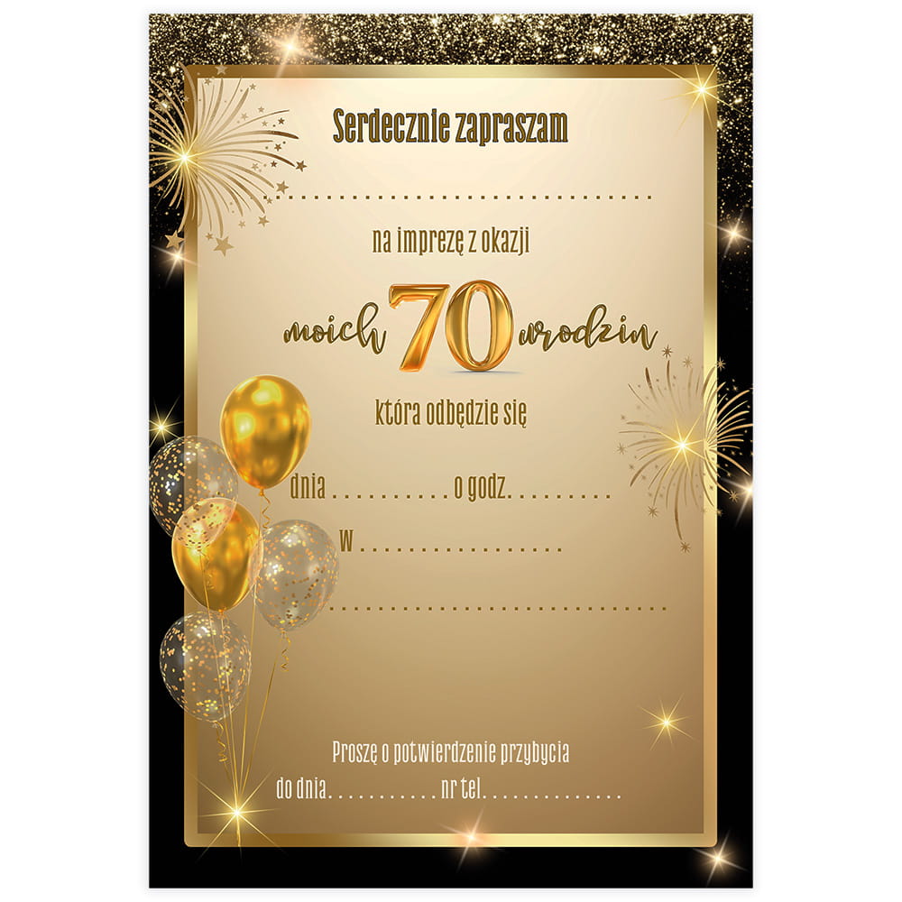 Stylowe zaproszenie na 70 urodziny, które łączy w sobie klasyczną czerń ze złotymi dodatkami, tworząc efektowny i elegancki wygląd. Na przedniej stronie zaproszenia widnieje duża, złota cyfra "70" otoczona złotymi fajerwerkami i dekoracyjnymi elementami, co dodaje blasku i uroczystego charakteru. Wewnątrz zaproszenia znajduje się miejsce na wpisanie wszystkich istotnych informacji dotyczących przyjęcia. To zaproszenie jest idealnym wyborem dla tych, którzy chcą uczcić swoje siedemdziesiąte urodziny w elegancki sposób.