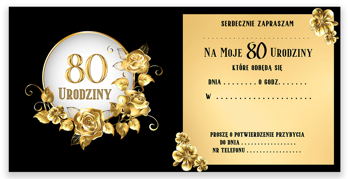 Zaproszenie na osiemdziesiąte urodziny szykowne i dostojne, z bogatą złotą kolorystyką i klasyczną czcionką. Liczba „80” otoczona złotymi różami podkreśla elegancję i wyjątkowy charakter okazji. Wnętrze utrzymane w złoto-kremowej kolorystyce z miejscem na informacje dotyczące wydarzenia.