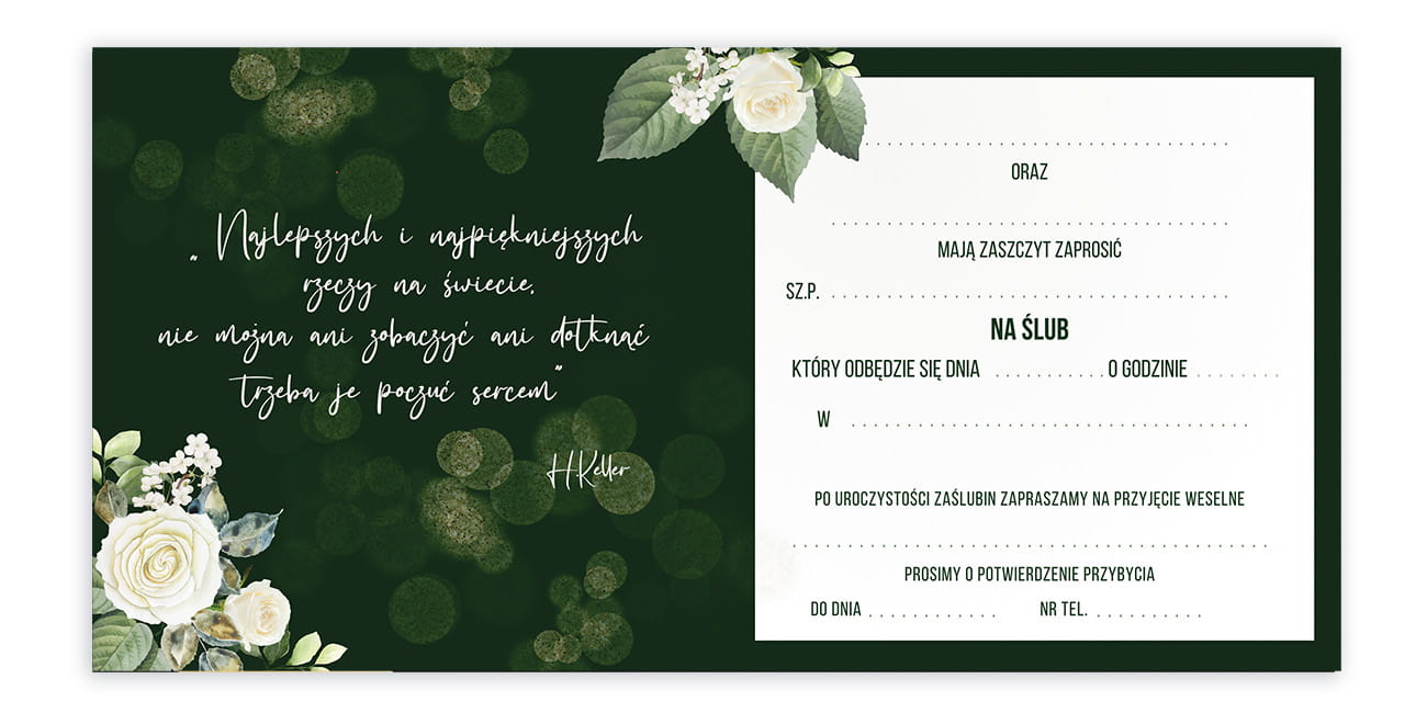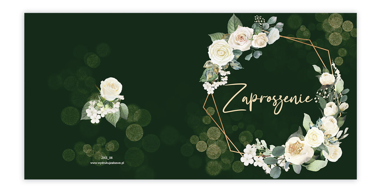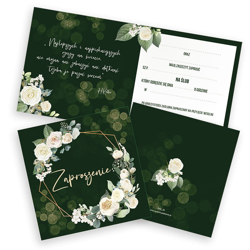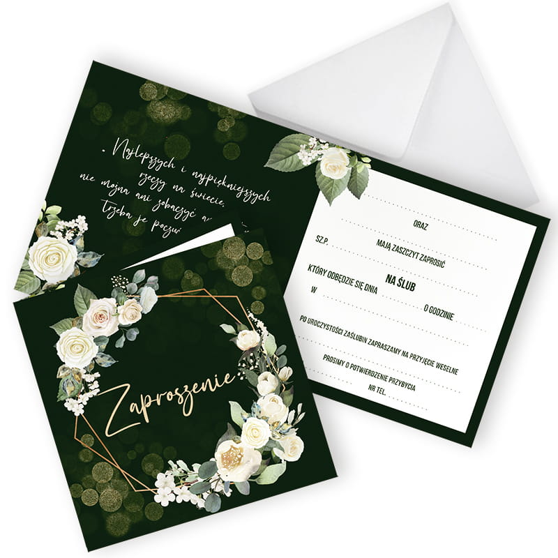 Zaproszenia ślubne w odcieniu butelkowej zieleni zachwycają swoją elegancją i świeżością. Zewnętrzna strona dekorowana jest motywem delikatnej złotej ramki, otoczonej białymi kwiatami, co nadaje im subtelny i wyrafinowany charakter. Wnętrze zaproszenia wypełniają delikatne motywy kwiatowe w harmonijnych kolorach bieli i zieleni, tworząc spójną i estetyczną kompozycję. Sentencja wraz z przewidzianym miejscem do samodzielnego uzupełnienia na indywidualne informacje umożliwiają personalizację, czyniąc każde zaproszenie unikatowym. Na odwrocie kontynuowany jest motyw kwiatów, dopełniając całość projektu i podkreślając elegancję zaproszeń.